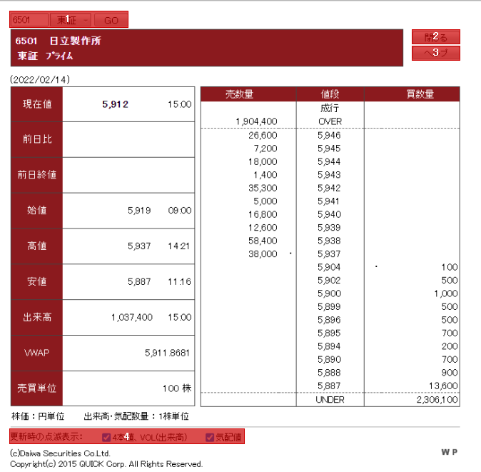 ※当該銘柄が上場していない市場を指定すると、「銘柄情報なし」と表示され、株価情報が表示されません。